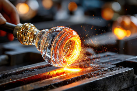 A glassblower shapes molten glass with sparks flying