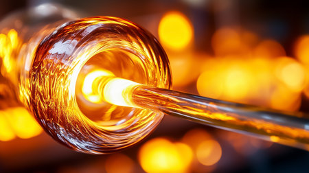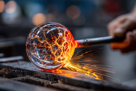 Witness the captivating art of glassblowing as an artisan shapes molten glass into an intricate deli design. The glowing material transforms with skill and passion in a vibrant workshop environment.
