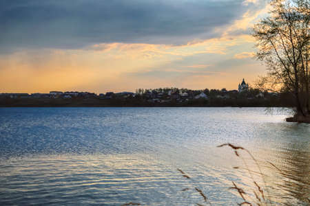 Town sea coast at the sunset evening.Sun rays passing through storm clouds over the lake bay town. Urban image.Golden hour.