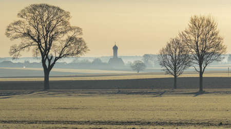 Morning dawning outside a german village with church on meadow with blooming trees