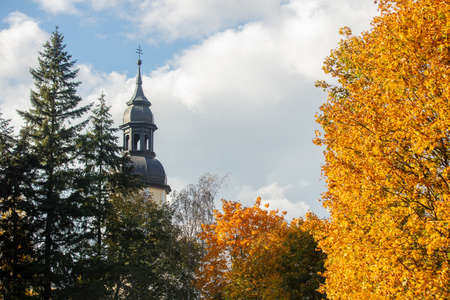 church bell tower in the middle of autumn trees