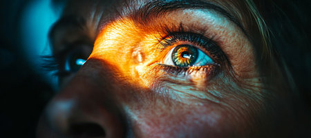 Intense macro shot of a person's eyes with detailed textures. Hyper-realistic close-up. Human emotion and vision concept. Design for health brochures, scientific presentations. Macro shot with high detail focus.