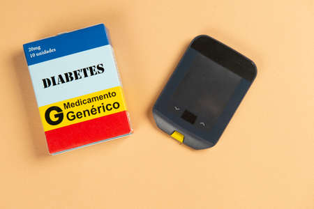 Fake medicine box with the name of the disease Diabetes and a glucometer