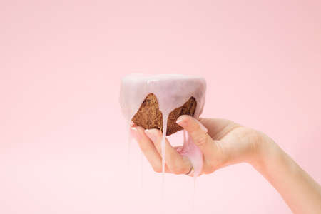 A beautiful female hand holding half a coconut from which a slime comes out. Pink background.