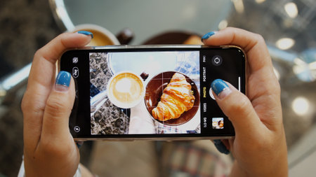 Close up of woman holds modern smartphone and taking pictures of her morning breakfast coffee and tasty croissant buns to share photos on social media resources