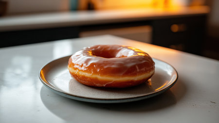 A beautiful glazed doughnut sits on a wooden surface, bathed in soft natural light. This image evokes a sense of warmth and indulgence, perfect for bakery and dessert imagery.