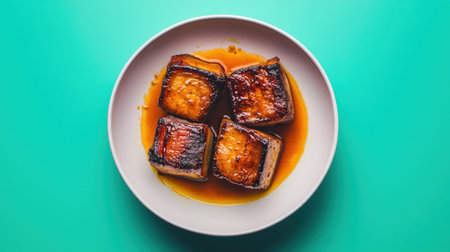 A visually striking presentation of caramelized pork belly served on a white plate, showcasing rich flavors and appealing textures against a vibrant turquoise background.