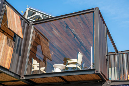 Image wooden terrace next to buildings with large windows, a sunny day