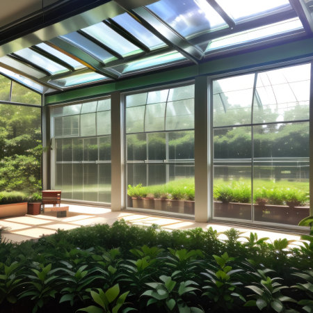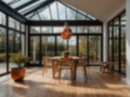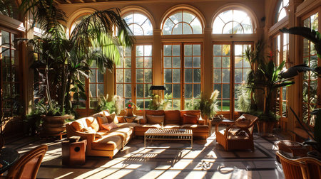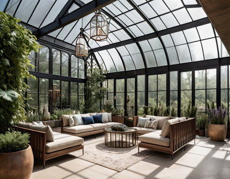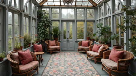A serene orangery with plants, sunlight through large windows, and cozy seating