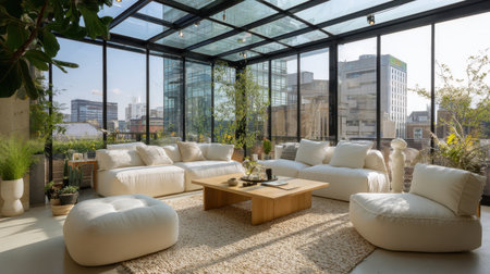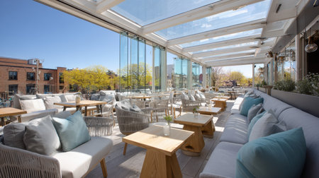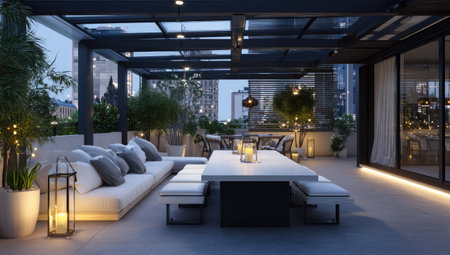 This image showcases a modern terrace featuring a seating area with plush cushions and a dining space. The design incorporates a sleek table with benches, and the overall composition is enhanced by soft lighting and a glass ceiling. Suitable for various commercial applications, the setting suggests a blend of indoor and outdoor living.