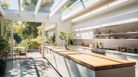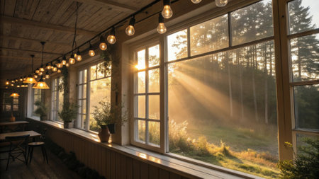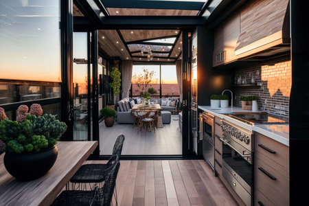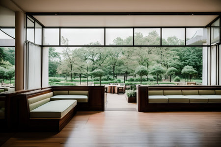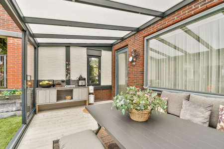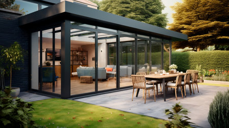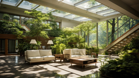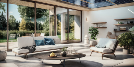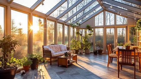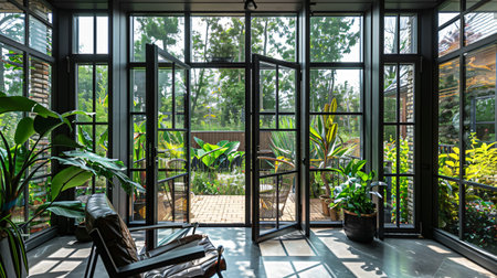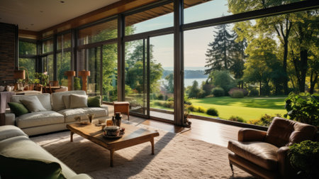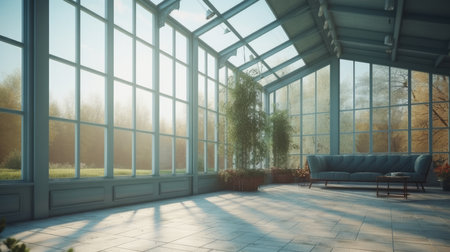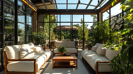 Sunroom A room with large windows or glass walls. AI generated illustration