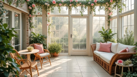 Sunlit conservatory with rattan furniture and lush greenery. That the image is generated using AI.