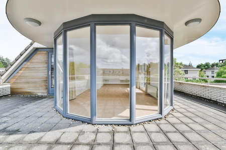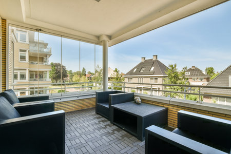 Cute design of a huge balcony of a luxury house with a tiled floor
