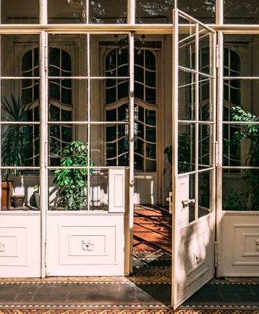 Opened old painted wooden and glass door on terrace or veranda with green plants.