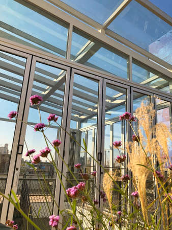 Hotel terrace with plants and glass fence : Generative AI
