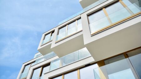 Contemporary residential building exterior in the daylight. Modern apartment buildings on a sunny day with a blue sky. Facade of a modern apartment building