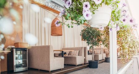 Outdoor large restaurant's terrace patio in light natural eco style. Selective focus, copy space. Wide banner