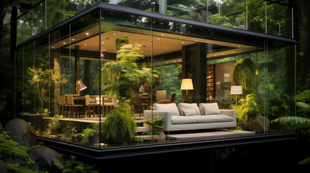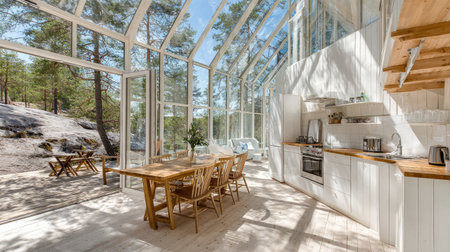 A stunning modern glass house that merges seamlessly with nature, featuring a bright and airy interior, stylish furniture, and an inviting dining area.