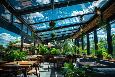 Bright sunlight floods a modern restaurant adorned with greenery and wooden furnishings. The glass roof offers a stunning sky view, creating an inviting dining experience surrounded by nature.