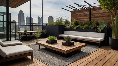 Bright and airy rooftop terrace showcasing a modern design, perfect for social gatherings or peaceful relaxation amid city views and natural light.