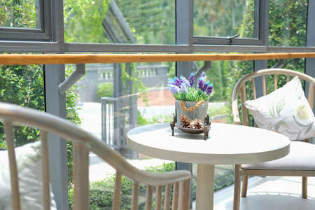Cozy veranda with comfortable chairs and trees