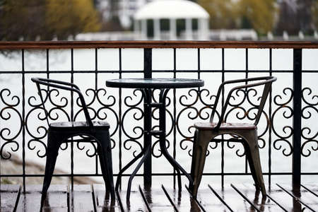 A fragment of a summer cafe on the lake shore. Metal table with two chairs in the rain.