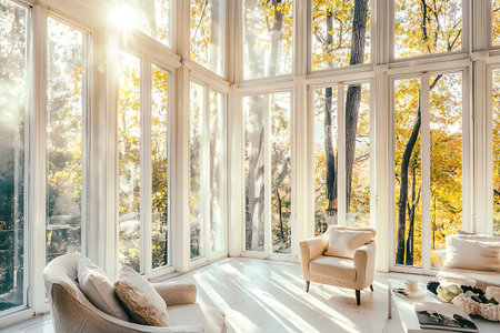 A bright and airy living room featuring expansive windows, showcasing stunning autumn foliage and sunlight, creating a cozy and inviting atmosphere.