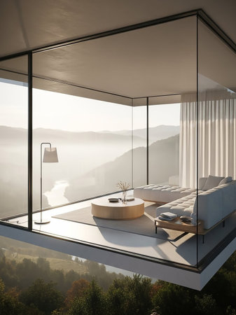 A minimalist modern living room with floor-to-ceiling glass walls offering a panoramic mountain view, featuring a floating balcony and contemporary furniture.