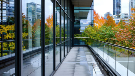A sleek glass balcony offers a unique view of an urban landscape adorned with vibrant autumn foliage, capturing the beauty of nature amidst modern architecture.