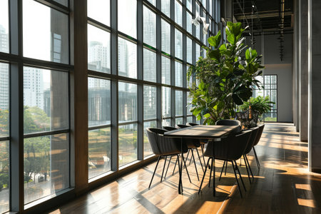A modern office with a large window and a table with chairs and a plant on it AI generated