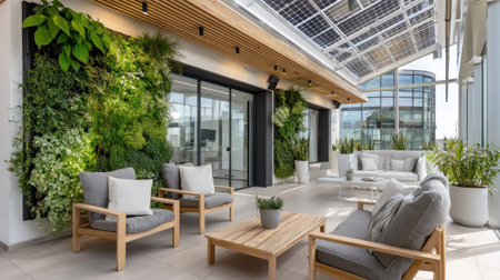 Comfortable seating area on a modern office terrace featuring solar panels, lush vertical garden, and sleek design, promoting a sustainable and relaxing workspace
