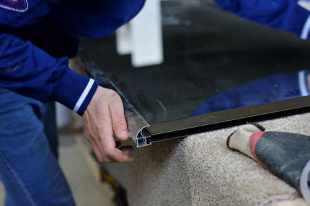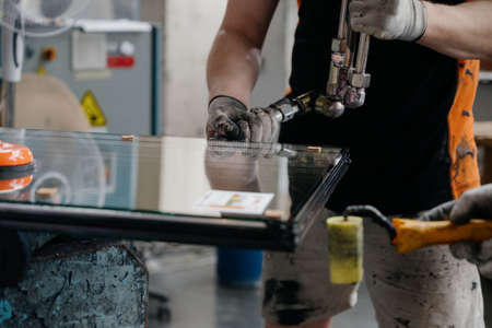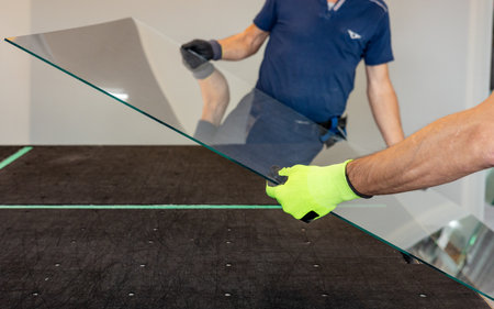 A glazier cuts glass in a glass factory, cutting thick glass, Professional glass equipment, Concept, glass panes for shower cabins, showcases, glass buildings, close up