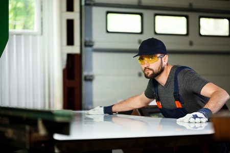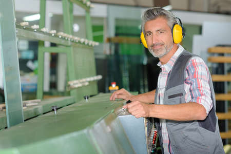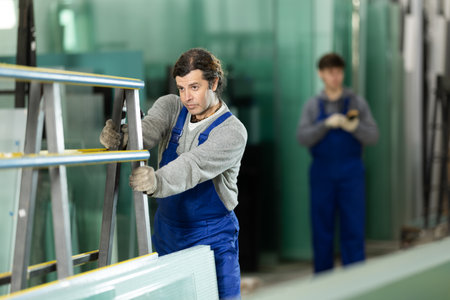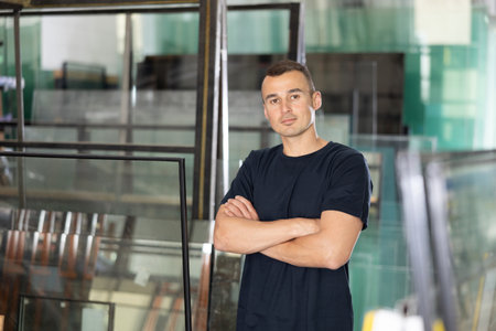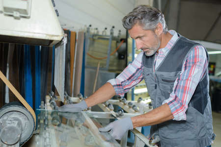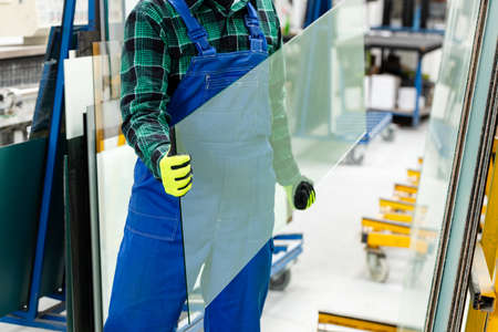 Male worker using control panel and lifting mechanism controls movement of window panes in an industrial workshop
