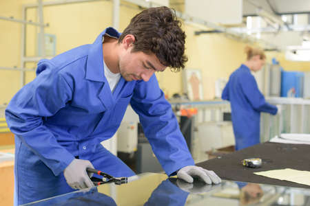 Glass technicians are cutting glass using glass tools according to the customer's order.