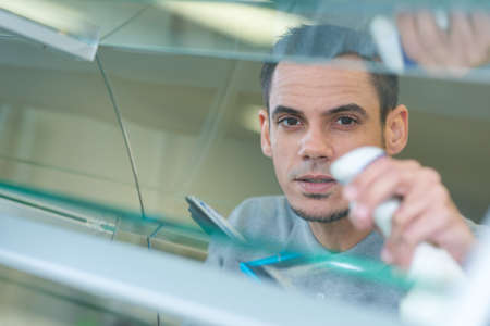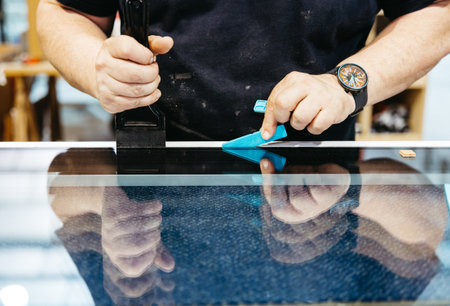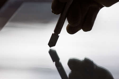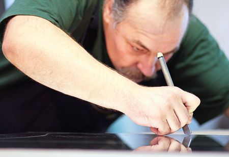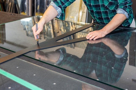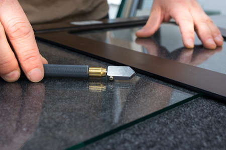 A glazier holding a cutting cutter in his hand and getting ready to cut glass