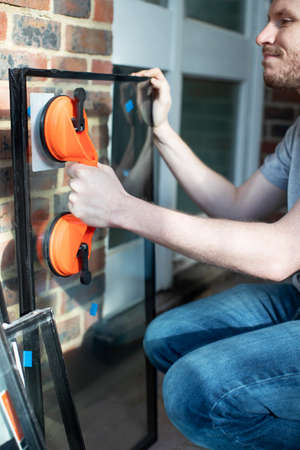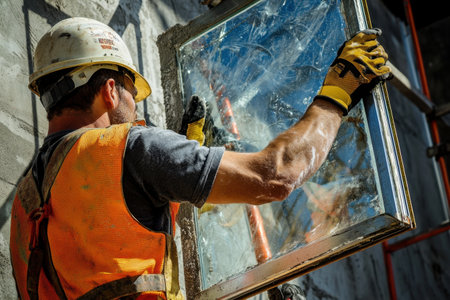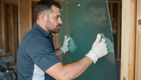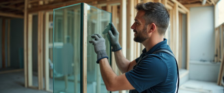 A skilled craftsman, wearing gloves and a navy shirt, carefully positions a glass panel in a partially constructed space, surrounded by wooden framing. His focused expression and steady hands reflect dedication and expertise, highlighting the artistry involved in creating functional beauty in construction.