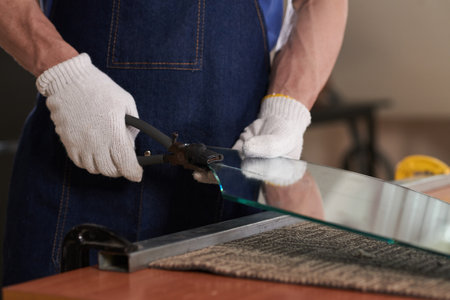 Close-up of glassworker in protective gloves cutting shape from glass with special tool