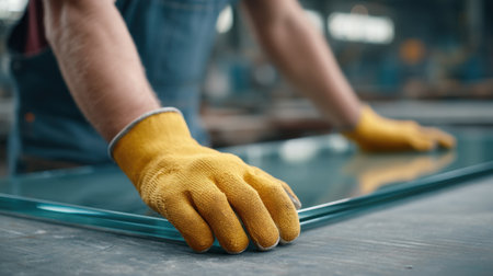 A dedicated worker in yellow gloves carefully handles a glass sheet in a workshop. The image highlights safety, precision, and craftsmanship in glass manipulation.