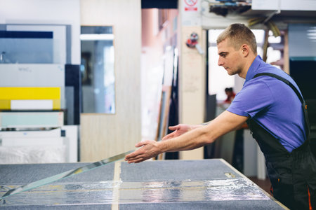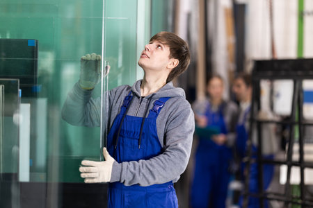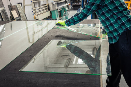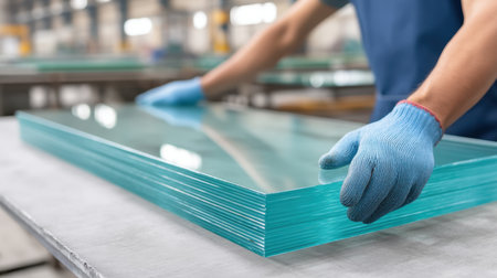 A skilled worker with protective gloves carefully handles flat glass sheets in a busy manufacturing facility, showcasing quality craftsmanship and industrial processes.