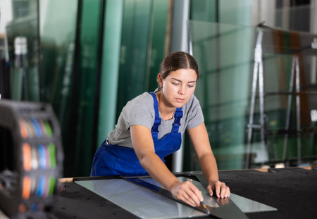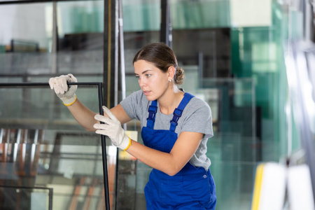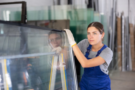 Female worker checks the quality of made window glass in an industrial workshop, marks the data in documents