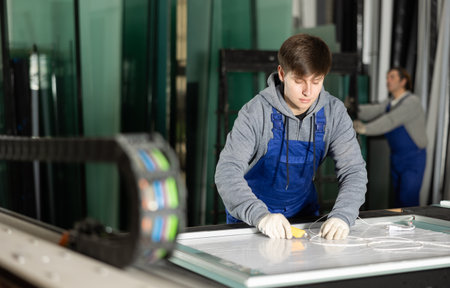 Glazier worker cutting glass with compass glass cutter in a workshop. Industry