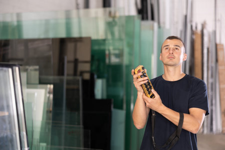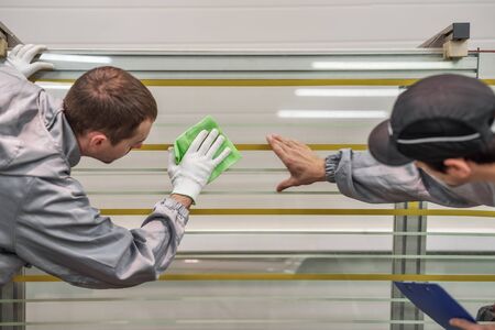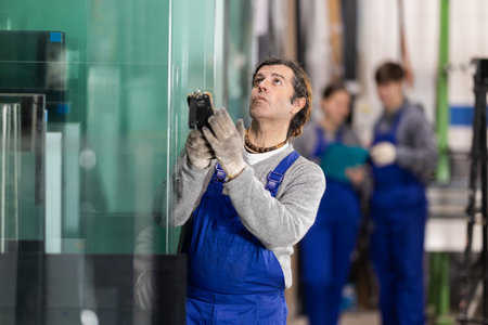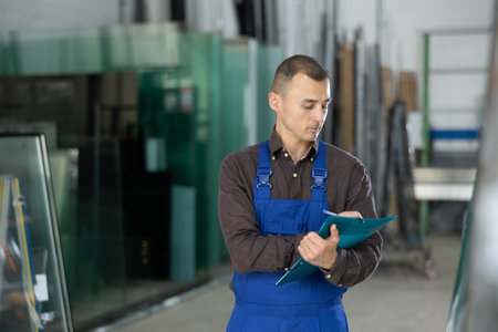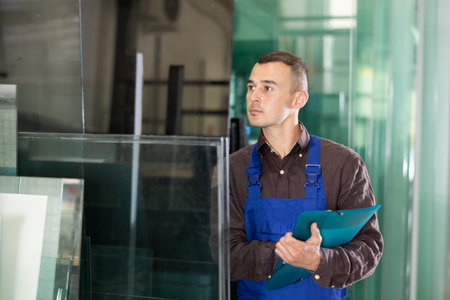 Experienced worker checks the quality of made window glass in an industrial workshop, marks the data in documents