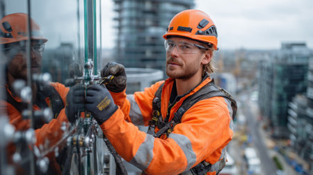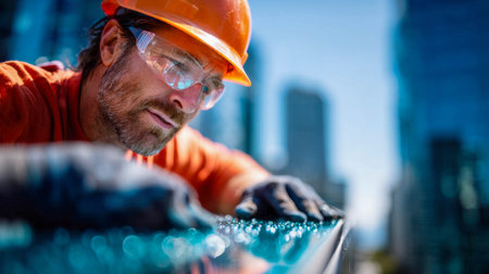 Focused construction worker in safety helmet and goggles working on a skyscraper exterior under bright sunlight.