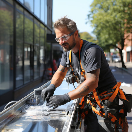 A man in a yellow vest and safety glasses is working on a window. The sky is blue and there are clouds in the background