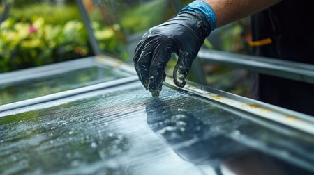 Waterproof silicone being applied to a greenhouse glass panel seam