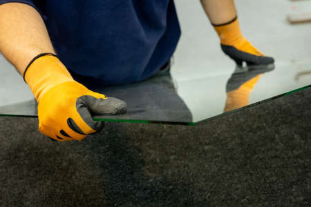 the glazier takes a piece of mirror off the table. Glass factory, manufacture
