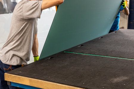 Glaziers place a large sheet of thick glass on the table by hand. Glass work