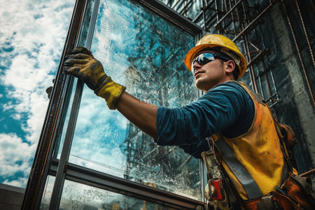 A skilled craftsman, wearing gloves, carefully positions a large glass panel against a wooden frame, showcasing his concentration and expertise. The warm tones of the wooden structure contrast with the cool, reflective surface of the glass, creating a dynamic interplay of materials in this construction scene.