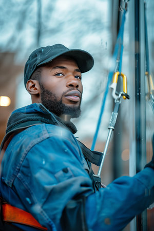 Skyscraper window cleaner, a dangerous profession at height with a safety rope. A man in a helmet wipes the window. promalpinism. rope access, Industrial mountaineering.