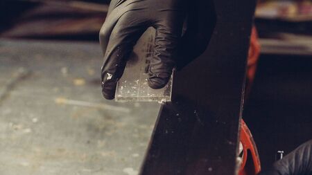Ski maintenence. Removing excess wax from race ski base plastic scraper. Ski service and repair. Winter shop worker doing base repair. Rental workshop service. Repairman In Workshop Ski Service.